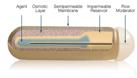 ALZET® Osmotic Pumps 是體積只有膠囊大小的滲透壓泵,符合 USP 醫(yī)療塑料膠材料生物相容性標(biāo)準(zhǔn),可植入實(shí)驗(yàn)動物皮下或腹腔內(nèi),直接或通過導(dǎo)管以 ul/小時(shí)的速度緩慢持續(xù)準(zhǔn)確地送出測試藥劑。Alzet 緩釋泵由外到內(nèi)分為三層(如下圖所示),最外層是半透膜材料(Semipermeable Membrane),最內(nèi)層為不透水彈性材料制成的貯藥囊(Impermeable Reservoir),中間為高滲的鹽夾層(Osmotic Layer)。當(dāng)泵體被植入動物體內(nèi)時(shí),由于滲透壓差迫使體液透過泵表面的半透膜流向高滲鹽夾層,擠壓貯藥囊,使藥物(Agent)按照預(yù)計(jì)速度經(jīng)導(dǎo)流管(Flow Moderator)釋放到動物體內(nèi)。