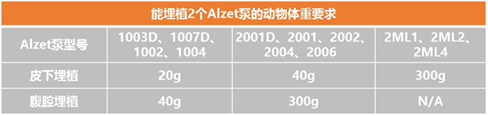 埋植多個(gè)Alzet泵必須確保動物體重足夠大,能容納多個(gè)泵的大小和重量。下表總結(jié)了埋植2個(gè)指定型號給藥泵時(shí)動物需要滿足的最小體重。