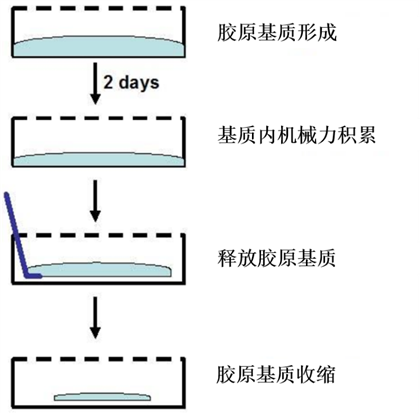 細胞收縮后膠原基質(zhì)的形態(tài)變化(虛線表示膠原基質(zhì)的邊緣)