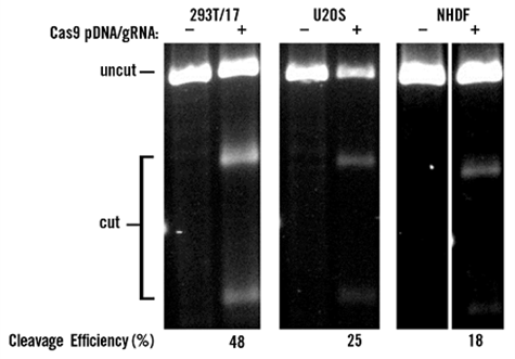 用TransIT-X2®分別在293T/17、U2OS和NHDF細胞中共轉(zhuǎn)Cas9質(zhì)粒DNA與gRNA實現(xiàn)了高效的基因編輯