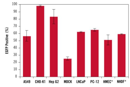 用TransIT-X2®將EGFP質(zhì)粒轉(zhuǎn)染到多種細胞系和原代細胞中都實現(xiàn)了高效表達