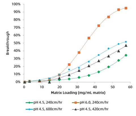 AlbuPure®具有卓越的白蛋白融合蛋白結(jié)合性能,如圖4所示,研究人員在不同pH值不同流速的上樣條件下,探究了AlbuPure®對scFv-rHSA的動(dòng)態(tài)結(jié)合載量,結(jié)果表明,在pH=4.5,240cm/h線性流速下,AlbuPure®對目標(biāo)融合蛋白的動(dòng)態(tài)結(jié)合載量最佳,10%流穿時(shí),載量高達(dá)38.4mg/mL。
