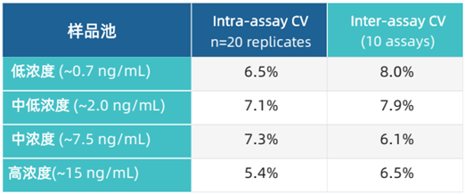 對(duì)已知濃度的4個(gè)樣品池進(jìn)行批內(nèi)(Intra-assay)和批間(Inter-assay)精確性評(píng)估。