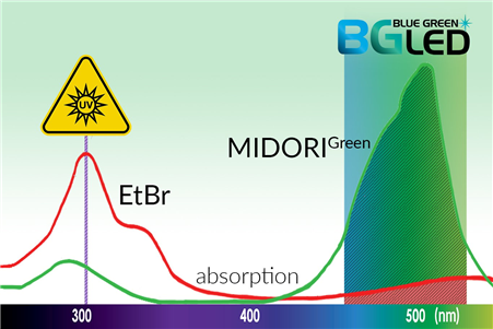 紫外光與EtBr染色至今仍一起被用于分子生物學(xué)實(shí)驗(yàn)室中檢測核酸。然而紫外光譜會導(dǎo)致DNA樣品的修飾和降解,30秒的紫外線曝光足以大幅降低克隆效率。藍(lán)/綠LED在470 nm - 520 nm處發(fā)出安全可見光,這種光譜對 DNA 沒有破壞性,與紫外光相比,DNA完整性和克隆/測序效率完全不受影響,即使在長時(shí)間的光照下也是如此。MIDORIGreen系列核酸染料經(jīng)過優(yōu)化,可在紫外光或藍(lán)/綠光激發(fā)時(shí)獲得更亮的信號,同時(shí)也兼容紫外光。