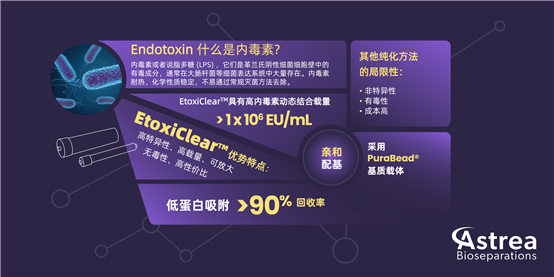 本文將推薦一款來(lái)自英國(guó)Astrea Bioseparations的Etoxiclear?層析介質(zhì),它是一種高性能、非離子交換、合成的親和層析吸附劑,可經(jīng)濟(jì)高效地去除內(nèi)毒素,支持GMP生產(chǎn),有凝膠和一次性預(yù)裝柱兩種形式產(chǎn)品,滿足不同的工藝需求。