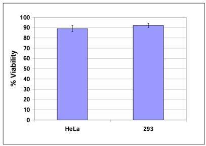 Fig 1?細(xì)胞活力檢測:按照實驗方案回收HeLa和293細(xì)胞培養(yǎng)6天,用臺盼藍(lán)法測定細(xì)胞活力。