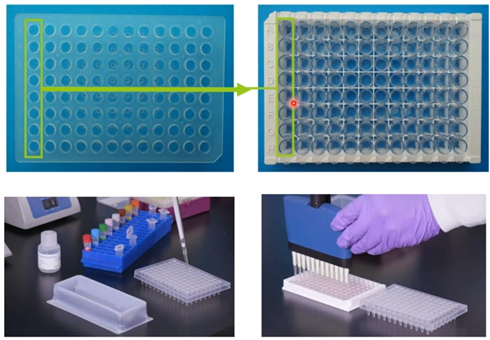 在向孔板加樣時(shí),最重要的是要思考完成每一步驟需要多長(zhǎng)時(shí)間,每一步驟的移動(dòng)方向是什么。對(duì)于這種情況,預(yù)先將待檢樣品和酶標(biāo)二抗加入低結(jié)合板內(nèi),然后再整個(gè)轉(zhuǎn)移到檢測(cè)孔板中,這樣能夠大幅減少將樣品添加到檢測(cè)板時(shí)造成的加樣誤差。
