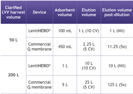下圖是VSV-G LVV樣品在不同流速下通過LentiHERO(LH)與Q膜流穿液的TU和p24檢測(cè)結(jié)果,LentiHERO對(duì)LVV的結(jié)合能力顯著高于Q膜。由此表明,LeniHERO在LVV流穿之前能夠處理更大體積的料液。