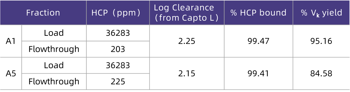 As can be seen from the test results (Table 4), after the feed solution was purified by HCPure?, the aggregate content decreased from the initial 6.7% to 2.9%, demonstrating that HCPure? can significantly remove aggregates from the feed solution.