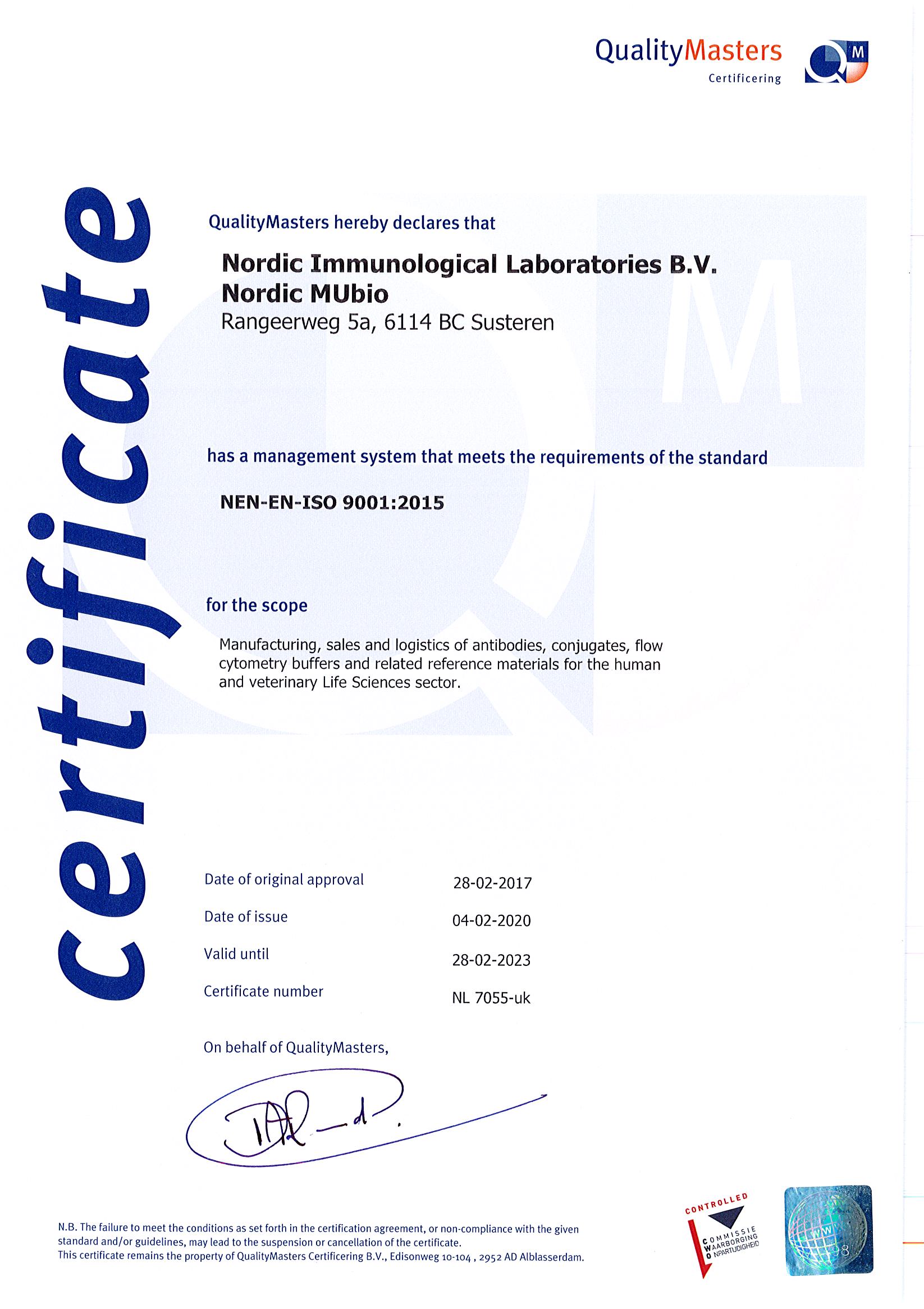 Nordic-MUbio公司供應2000多種用于生物醫(yī)學和獸醫(yī)研究的基礎免疫學試劑,包括抗血清、抗體、免疫復合物、純化蛋白、對照品、血清蛋白標準品和其他校準品。他們包括高度特異性的單克隆抗體,以及用于不同試驗體系的標記二抗。Nordic-MUbio嚴格遵守IS09001標準生產(chǎn)高質量的抗體,80%以上的抗體經(jīng)過冷凍組織免疫組化檢測,近70%的產(chǎn)品通過流式細胞術驗證,50%的產(chǎn)品通過WB驗證。同時Nordic-MUbio也是斑馬魚抗體開發(fā)的引領者,擁有50多種可用于斑馬魚熒光檢測的抗體。Nordic-MUbio的核心優(yōu)勢在于每一個單項產(chǎn)品都提供及時的技術支持并擁有廣泛的科學數(shù)據(jù)、圖片和文獻參考資料。