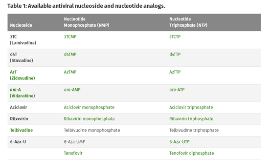 抗病毒核苷/核苷酸類似物可以通過抑制病毒復(fù)制的幾個(gè)關(guān)鍵過程來抑制病毒繁殖,它們通過與天然的dNTP/NTP競爭結(jié)合到新的病毒核酸中,從而導(dǎo)致鏈終止或者誘變。在細(xì)胞培養(yǎng)實(shí)驗(yàn)中,可以用抗病毒核苷酸的非磷酸化核苷變體,這種核苷酸在細(xì)胞內(nèi)被多種病毒和/或宿主激酶激活,從而發(fā)揮(tri)磷酸化形式的抗病毒作用。