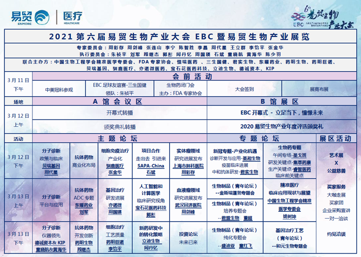 2021第六屆易貿(mào)生物產(chǎn)業(yè)大會(huì)EBC將于3月11-13日在蘇州國際博覽中心隆重召開。EBC 2020年參會(huì)人數(shù)2724人,2021年將突破4000人規(guī)模,參會(huì)人群覆蓋創(chuàng)業(yè)者、科學(xué)家、臨床醫(yī)生、投資人和供應(yīng)商等。同期開展的易貿(mào)生物產(chǎn)業(yè)展覽,將有超過200家儀器、耗材、服務(wù)等供應(yīng)商展出,會(huì)+展聯(lián)動(dòng)的EBC,已成為國內(nèi)外生物產(chǎn)業(yè)高層交流與合作的標(biāo)桿平臺(tái)。