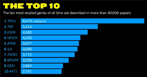 科學(xué)家們在癌癥領(lǐng)域做了大量的研究,目前的主要策略是降解突變體p53,或者改造突變體p53的蛋白折疊,使其恢復(fù)野生型p53的構(gòu)象和功能。在藥物研發(fā)上,想要抑制一個蛋白的功能容易,想恢復(fù)一個蛋白的功能卻很難,所以,到目前為止仍沒有一款靶向p53的抗癌新藥上市,該領(lǐng)域藥物開發(fā)已成為人們最關(guān)注的靶點之一,在Nature雜志2017年的一項統(tǒng)計中,TP53基因以絕對優(yōu)勢位列過去幾十年最熱門研究基因榜第一名。