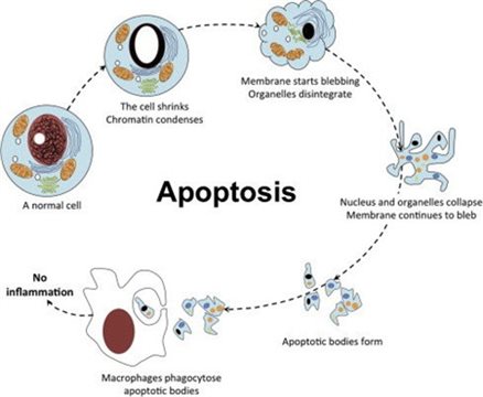 凋亡的特征具有明顯的形態(tài)變化以及特定caspase和線粒體控制通路的激活。凋亡細(xì)胞出現(xiàn)細(xì)胞體積縮小,與周圍細(xì)胞脫離,然后細(xì)胞質(zhì)密度增加,通透性改變,染色質(zhì)濃縮和核碎裂,并顯示出稱為膜起泡的典型變形的膜,膜內(nèi)側(cè)磷酯酰絲氨酸外翻到膜表面,胞膜結(jié)構(gòu)仍然完整,無內(nèi)容物外溢,不引起周圍的炎癥反映。膜起泡可導(dǎo)致在垂死細(xì)胞邊緣形成小囊泡,稱為凋亡小體。凋亡小體可迅速被周圍的吞噬細(xì)胞吞噬。凋亡可以通過內(nèi)在或外在通路觸發(fā),內(nèi)在通路可以通過細(xì)胞應(yīng)激、DNA損傷、發(fā)育信號、存活因子缺失被激活,外在通路則是通過檢測到來自其他細(xì)胞的細(xì)胞外死亡信號來觸發(fā)的。