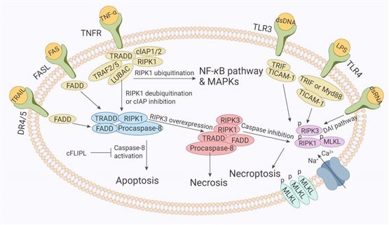 Fas又稱CD95,是由325個(gè)氨基酸組成的受體分子,它與其配體FASLG(CD178)結(jié)合可以啟動凋亡信號的轉(zhuǎn)導(dǎo)引起細(xì)胞凋亡。Fas具有特殊的死亡結(jié)構(gòu)域(DD,death domain),三聚化的Fas和FASLG結(jié)合后,使三個(gè)DD相聚成簇,吸引了胞漿中另一種帶有相同死亡結(jié)構(gòu)域的蛋白FADD。FADD是死亡信號轉(zhuǎn)錄中的一個(gè)連接蛋白,它由兩部分組成:C端(DD結(jié)構(gòu)域)和N端(DED)部分。C端與Fas的DD結(jié)構(gòu)域結(jié)合,N端連接另一個(gè)帶有DED的后續(xù)成分,由此引起N端DED隨即與無活性的caspase-8發(fā)生反應(yīng),進(jìn)而引起caspases級聯(lián)反應(yīng),誘發(fā)細(xì)胞凋亡。Fas/FASLG涉及許多癌癥和免疫疾病的發(fā)病機(jī)制,如多發(fā)性硬化癥[2]。