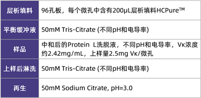 在該應(yīng)用案例中,研究人員使用大腸桿菌(E. coli )表達納米抗體Vκ,收獲液先經(jīng)過Protein L親和層析純化,洗脫液經(jīng)中和后調(diào)節(jié)成不同的pH(6.0-8.0)和電導(dǎo)率(6-18mS/cm),隨后以流穿模式上樣HCPureTM,收集流穿液和淋洗液,檢測Vκ和HCP的含量,以探究HCPureTM的最佳上樣條件。測試條件如下表所示: