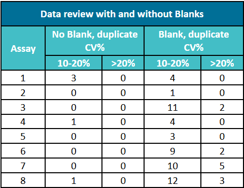 表2. 經(jīng)過空白對(duì)照校正后的CV%與未校正數(shù)據(jù)的CV%值對(duì)比